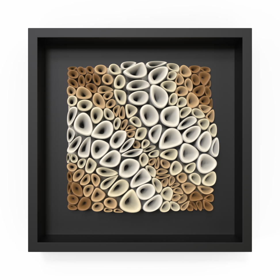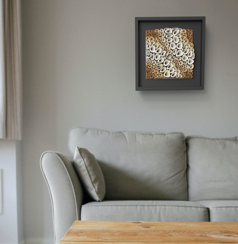 Der Holzrahmen ist 37 x 37 x 6 cm groß und die Korallen-Skulptur, in vier Fraben, besteht aus 150 Korallen und ist 25 x 25 cm groß.
